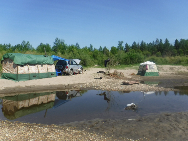 Встаём на галечнике у самой воды, т.к. в лесу кровососущие не дадут покоя. На берегу ветерок и комаров нет.