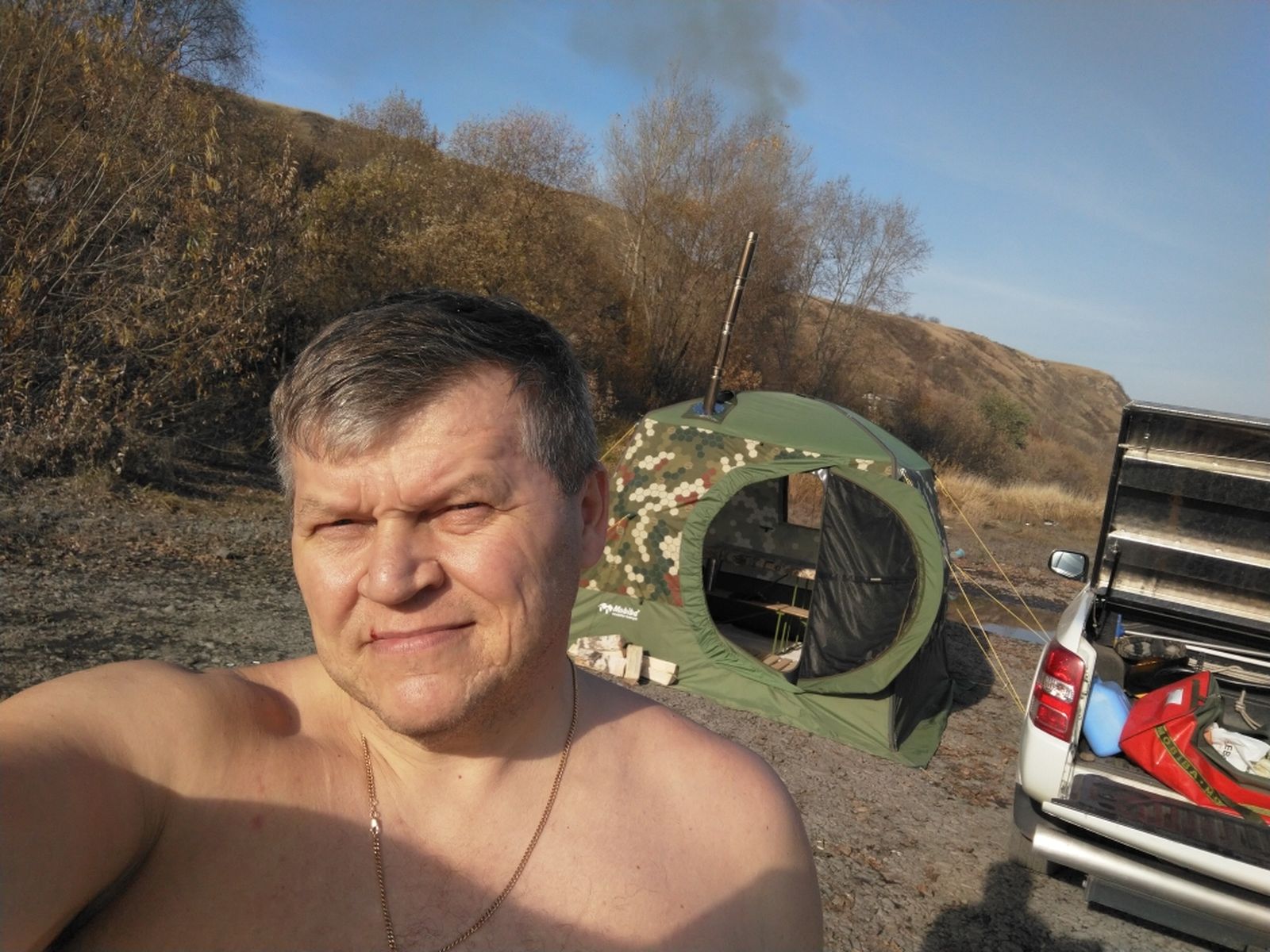 Да в наших банных процедурах самый облом это сворачивание мероприятия.Раньше, пока еще было не холодно, до талого лежал в палатке, пшикал воду на камни, и затем уже возле машины обтирался полотенцем и одевался. Не спешно начиная процедуру разборки бани, вытаскиваю полки, организуя столик для отдыха и чаепития. Кстати в печь я лью воду только питьевого качества, поэтому у меня всегда в наличии кипяток для чая имеется. Пока чаевничаешь, палатка уже подсохнет. В морозы конечно все по другому, во первых для себя сделал вывод, надо с собой брать отдельно футболку или рубаху, потому что при установке палатки и подготовке бани, неминуемо взмокнешь, попытался одежду просушить при разогнавшейся паробомбе - результат еще больше промочил. ИЗН тоже подумать -между слоями большой конденсат и обмерзание завязок. Завершал процедуры также ожидая пока печь почти прогорит и прекратится парогенерация, затем принес из машины полотенце, белье, штаны и обувь, приоткрыв дверь вполне комфортная атмосфера для переодевания, и только потом уже у машины верхняя одежда. Почаевничать решил прямо в палатке, думал подсохнет, но где уж там, все быстро замерзло. Ну а дальше как ты описал - облом и сборка :D