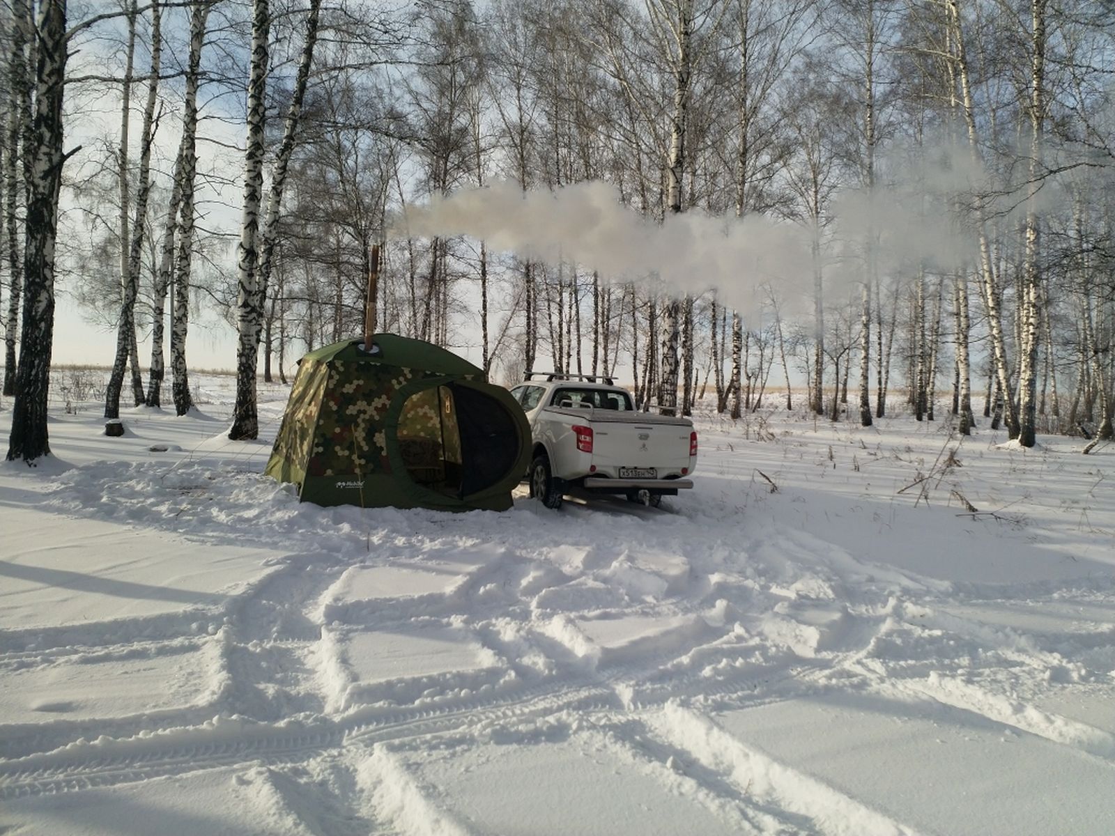 Ну вот, с очередной обновкой, выкуплены шикардос и накидка ИЗН-15. Значит баньке быть! Погода в воскресенье чудесная, солнечно и легкий морозец, запланированная на выходные замена светильников в гараже выполнена, срочная загрузка снаряги и бегом на приглянувшееся местечко.