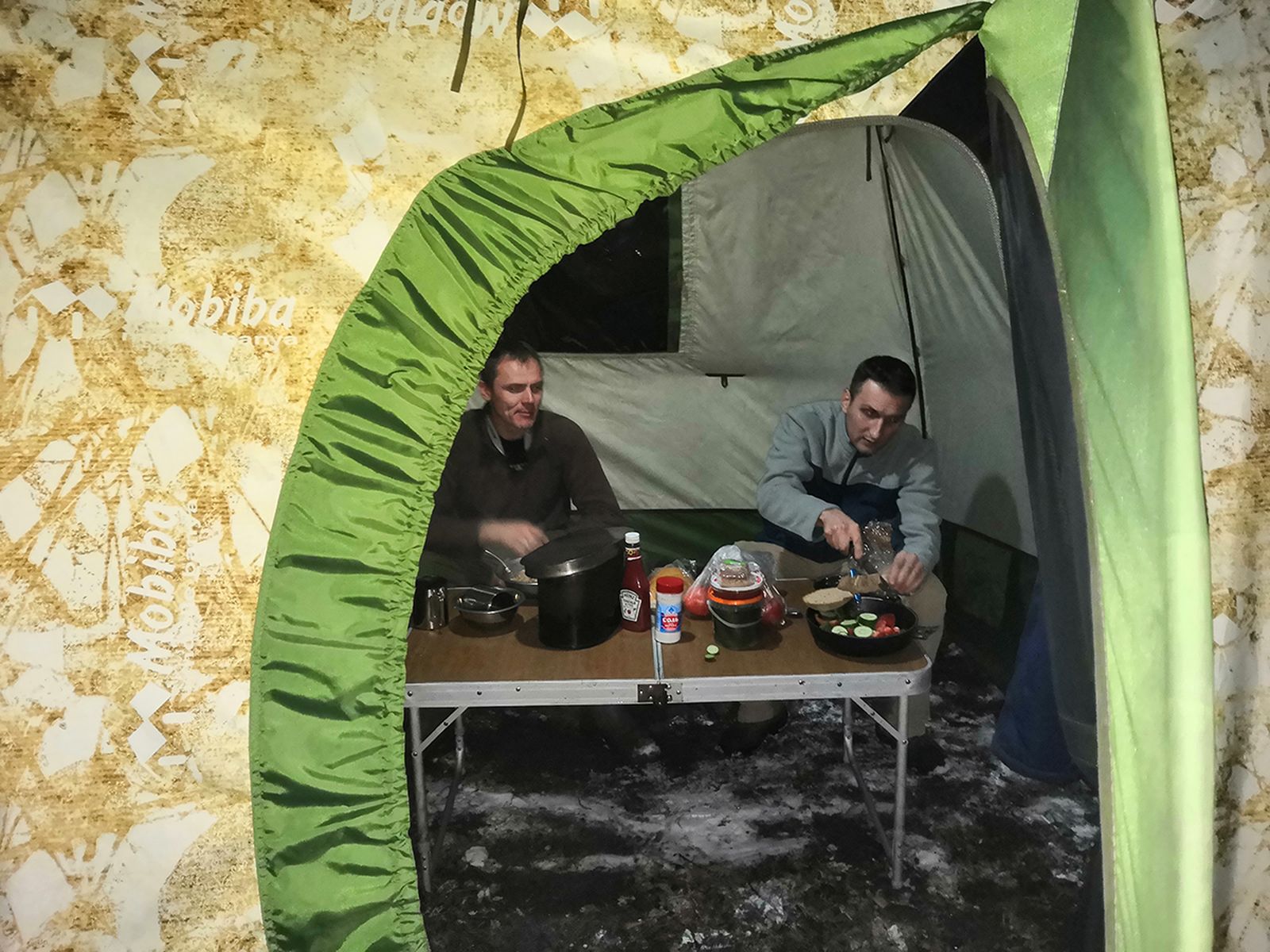В этот раз на стоянке сначала поставили Пятнашку, сбегали за дровами, а потом, уже в сумерках и Десятку. На костер забили, готовили на Согре. Пятнашка с Согрой давали такой запас тепла, что выходили на улицу зачем-либо без верхней одежды. И банная вакханалия повторилась.)) Снег сначала начал сыпать с дождем, ночью перешел в чистый дождь. И к утру почти весь снег съело, как и не было. Юбку у жилой палатки, чтобы не прикапывать, приваливали с наветренной стороны ненужными «запасными» вещами в гермах. Во вторую ночь Согру прикрывали чуть больше, подкидывали через 4-4.5 часа. Что касается мобильности Мобибы. В байдарку Таймень-2 легко помещается весь банный арсенал, перечисленный выше, личные вещи и продукты, запасная палатка, тент 4х6(на всякий случай))), бензопила. При этом остается еще много свободного места под бортами. А сама байдарка остается легко управляемой. Да, все это при одном пассажире. Напоследок вопрос: друзья, а Мобибавирус лечится?)