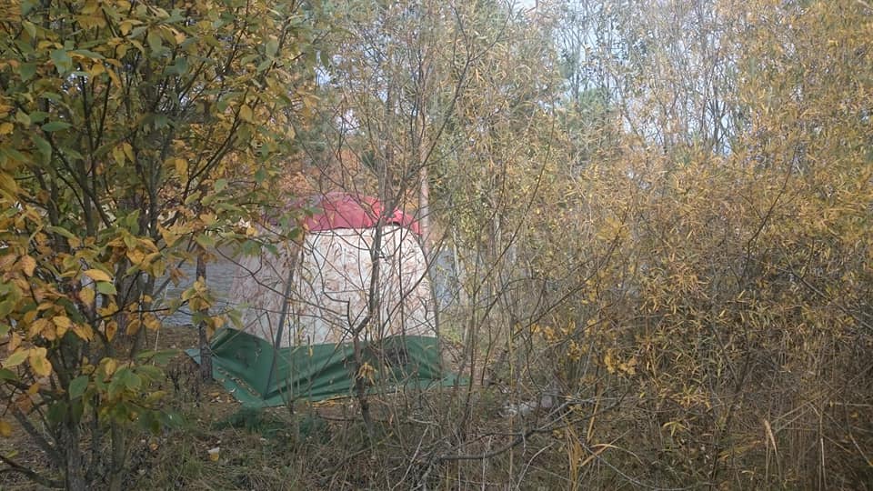 Баня к багажнику прилипла основательно, без неё теперь не получается. На улице полтора осенних градуса, сильный ветер, но довольно много рыбаков, в том числе и с ночёвкой. Надо было видеть их глаза , глядящие из под капюшонов тёплых курток на купающихся в ледяной воде чумачечих баньщиков. Вот она , наша кайфогенерирующая подстанция , стоит в кустах, не шелОхнется.