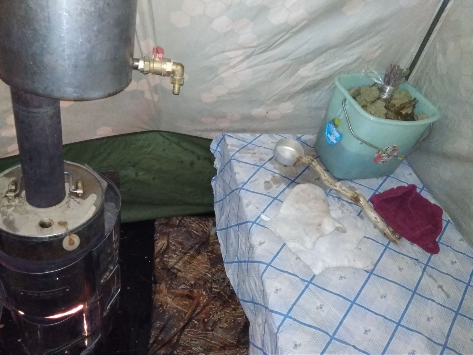 И всё готово к банному процессу! К этому моменту фонарь Кефир уже начал плавиться на верху, привязал его к резинки двери.