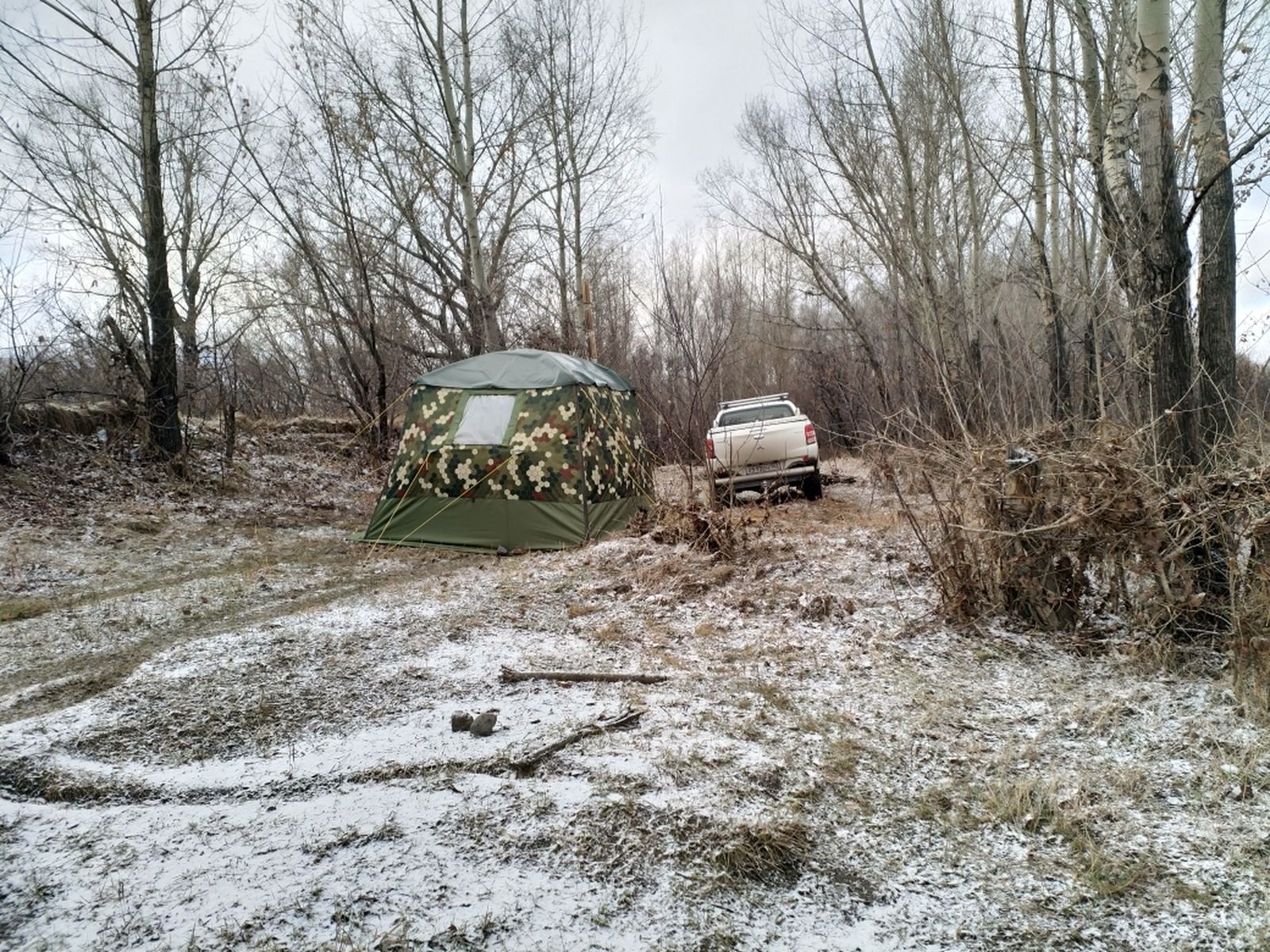 Самый геморр это конечно сворачивание баньки, как только дровишки прогорели, очень быстро палатка и тент замерзли, уложить их штатно не реально, пришлось скатать в комок и тащить домой на отогрев и просушку.