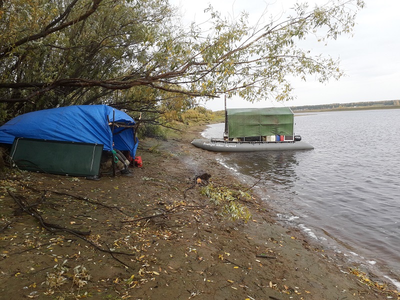 Ночь проходит спокойно и без происшествий. Нодья греет ровно, тепла всем хватает, никто не замерз и не промок\отсырел. Но утро преподносит нам неприятный сюрприз: Меняется ветер и начинается дождь. И то, и другое – неприятно, почти критично. Дождь – потому, что тента нет, а перемена ветра – потому, что нора больше не является укрытием от него, а наоборот. Пожалуй, ветер даже более вреден, а способы борьбы с ним ограничены. Дело здесь в том, что нам предстоит сейчас найти такой берег и такое место на нем, которое защищено от ветра с одной стороны, обеспечивает устойчивую связь – с другой и имеет подъездные пути для машины – с третьей. К тому же нам предстоит здесь еще раз ночевать: машина будет только завтра. Но вчерашняя рекогносцировка и изучение карты показывают, что такого места нет. Просто нет, и все. Место нашей ночевки – самая дальняя (если смотреть вверх по течению Васюгана) точка устойчивого приема; другая (такая же, но вниз по течению), находится от нас километрах в четырех. Вот где-то здесь нам и предстоит оборудовать ночлег. Ситуация осложняется тем, что наветренный берег заболочен и плоский, как стол, а подветренный (там, где сейчас царит затишье) – крутой яр, да еще и полностью лишенный дров. Значит, нужны нетрадиционные (зачеркнуто) нестандартные решения. И они у меня есть! Причем, не только решения, но и то, чем их можно реализовать. Давным -давно, в те забытые времена, когда неделю или полторы назад мы стартовали в Новиково, я притырил тент, которым мы накрывали груз в прицепе. Такой же терпаулиновый тент, какой был у нас, только не синего, а оливкового цвета. Тент изрядно «побит жизнью», на нем есть протертые дыры и обтрепанные места, он весь в грязи и песке, но все люверсы целые, «а это значит…». Его Андрей, который нас до Новиково довез, вообще говоря, выкинуть собирался, но я подобрал: и реку засорять ни к чему, и пригодиться может. Вот и пригодился! В общем, заморачиваемся для начала ходовым тентом. Получается симпатиШно. Кстати, видите просунутую между каркасом и тентом походную кровать? «От этой картины очень большая польза! Она дырку на обоях закрывает»; вот и кровать – тоже. Но дырок в тенте много, а кровать одна, в связи с чем мы логично подвели ее под самую большую.