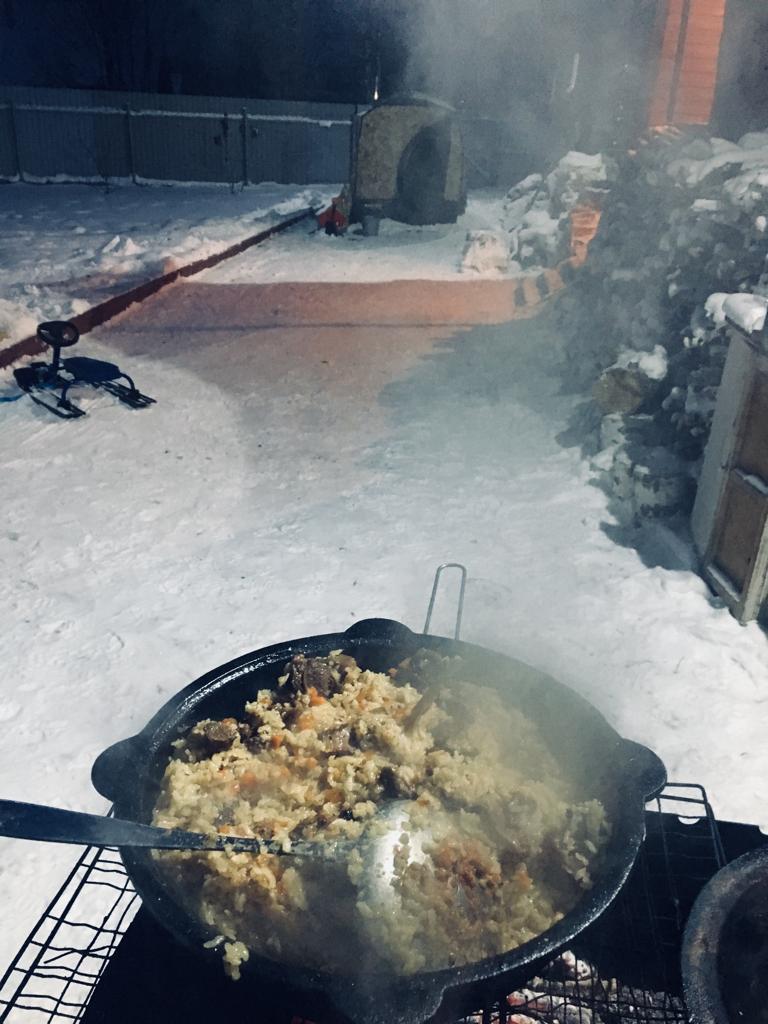 Вчера парились в МБ-1Т. На улице было -13, к вечеру -15. С теплым полом и засыпанной снегом юбкой в парилке было 90 градусов на уровне груди. В тамбуре ставили столик, для прохладительных напитков. Купались в снегу, параллельно готовился плов. Как жаль, что Мобиба появилась у меня только в этом году)