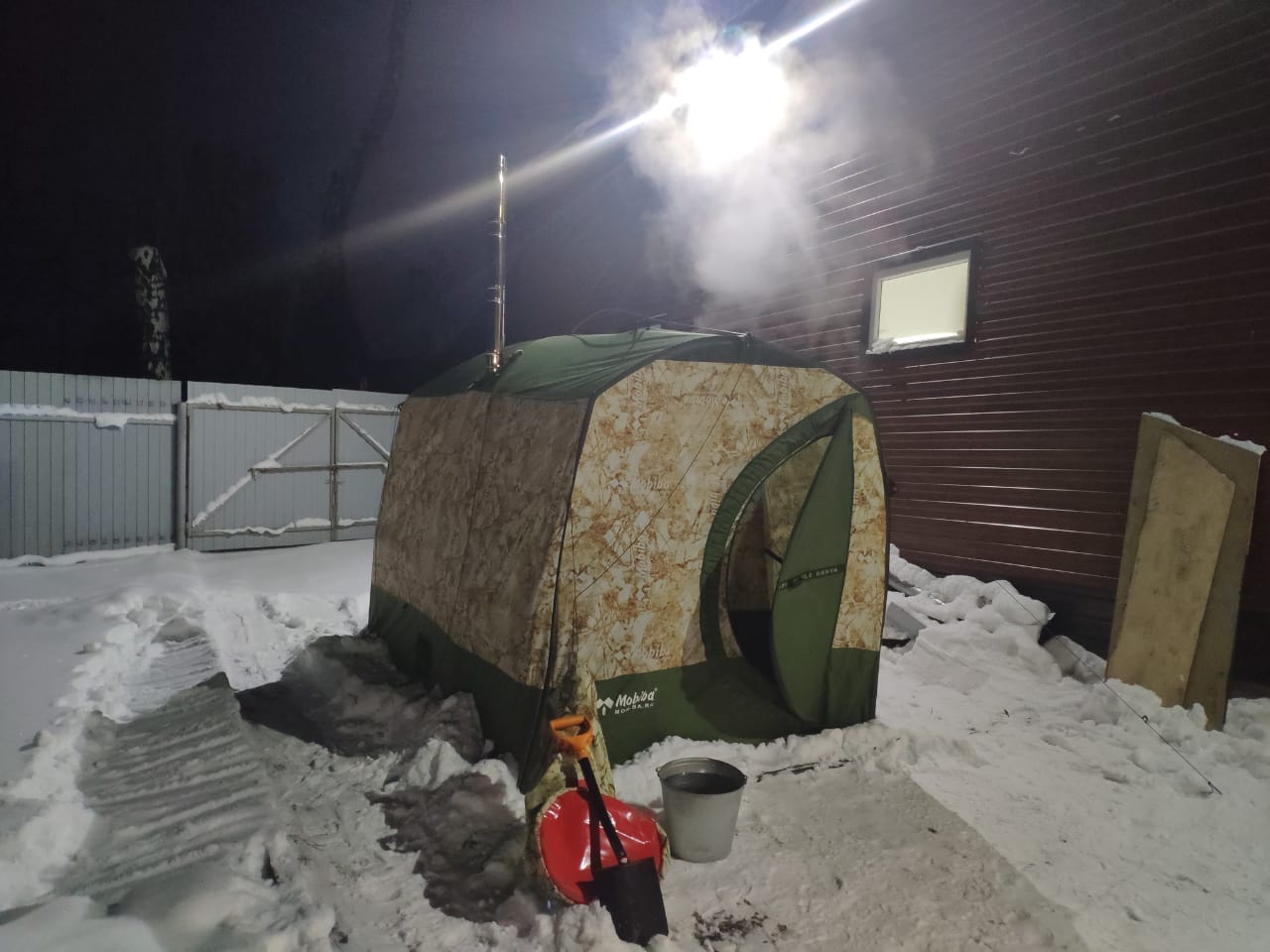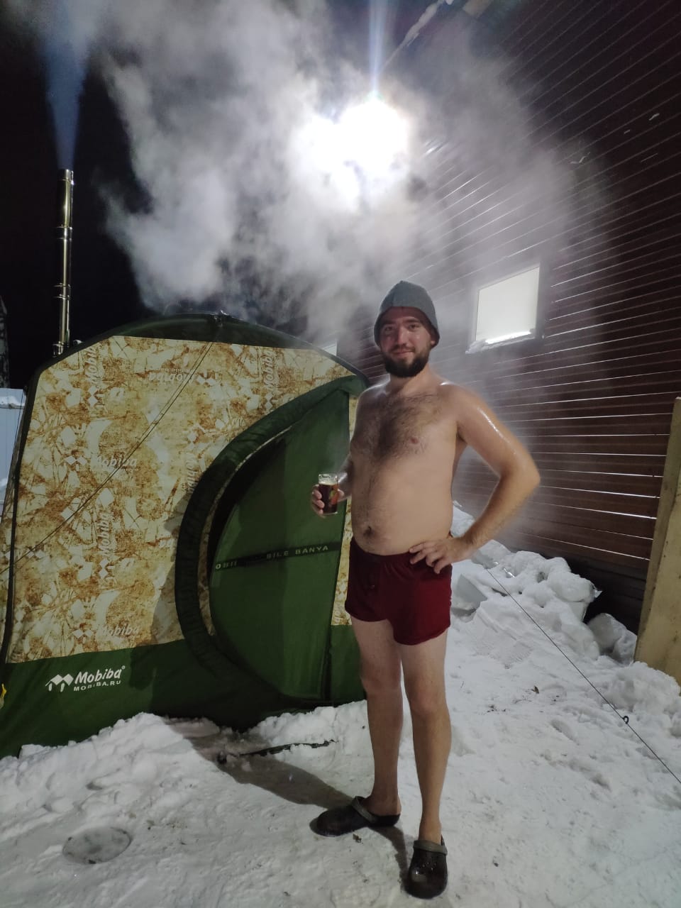 Вчера парились в МБ-1Т. На улице было -13, к вечеру -15. С теплым полом и засыпанной снегом юбкой в парилке было 90 градусов на уровне груди. В тамбуре ставили столик, для прохладительных напитков. Купались в снегу, параллельно готовился плов. Как жаль, что Мобиба появилась у меня только в этом году)