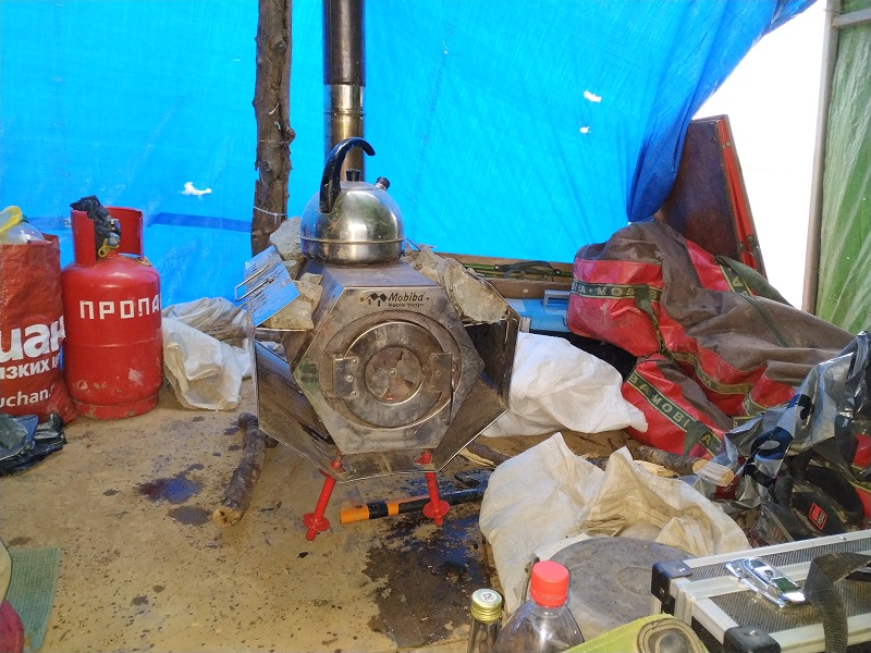 Между тем, в нашем импровизированном домике, несмотря на отсутствие одной стенки, тепло и уютно. Тент, конечно, шуршит, вибрирует и хлопает, но тоже как-то привычно, уютно и по-домашнему, мы же за ветром стоим. Печь работает «на двоечке», потому царящий на улице «ноль градусов Цельсия» нас совершенно не беспокоит: и в одной термухе уже комфортно, а по палубе мы ходим в тапочках на босу ногу; не натаскали бы песка и грязи, вообще босиком бы ходили. Ужин затягивается, но, в конце концов, мы все же убираем стол, расставляем кровати и ложимся спать с коллективным решением «спать до талого»: машина все равно не придет раньше обеда. М-да, хочешь насмешить Д-рвина – расскажи ему о своих планах. Просыпаюсь в 6 утра от грохота, хлопков и какой-то вибрирующей барабанной дроби. Нет, только не это, только не это! Хотя, чего, собственно, «не это», когда именно «это» - оно и есть: ветер, дующий с прежней силой, вновь поменял свое направление на 180 градусов. Мысленно плюнув в сердцах, я решаю «А, будь, что будет…», набиваю поверх тлеющих углей полную топку дров и снова проваливаюсь в дремоту, стараясь не обращать внимания на особо громкие хлопки тента и потрескивание постепенно рвущейся ткани.