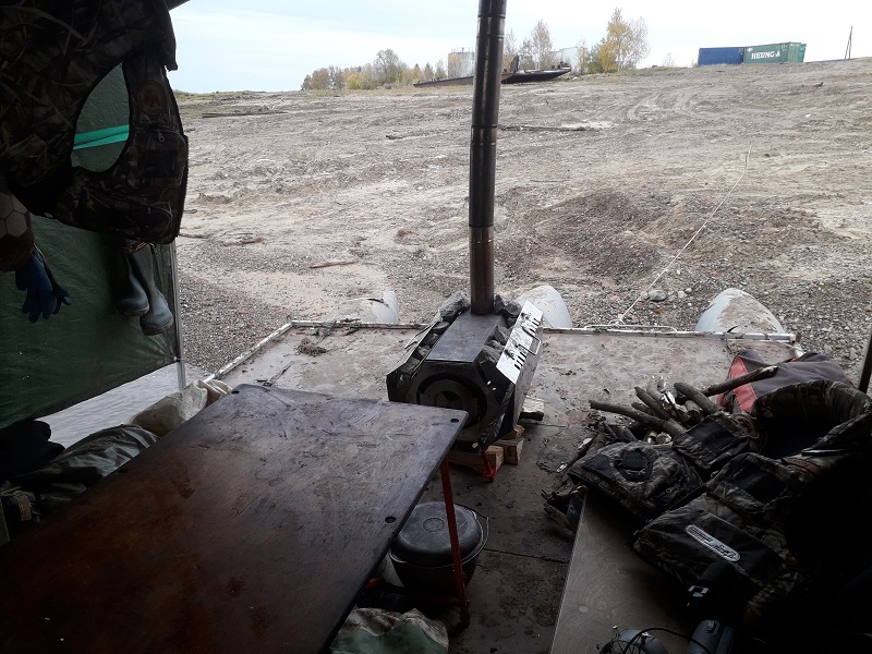Между тем, в нашем импровизированном домике, несмотря на отсутствие одной стенки, тепло и уютно. Тент, конечно, шуршит, вибрирует и хлопает, но тоже как-то привычно, уютно и по-домашнему, мы же за ветром стоим. Печь работает «на двоечке», потому царящий на улице «ноль градусов Цельсия» нас совершенно не беспокоит: и в одной термухе уже комфортно, а по палубе мы ходим в тапочках на босу ногу; не натаскали бы песка и грязи, вообще босиком бы ходили. Ужин затягивается, но, в конце концов, мы все же убираем стол, расставляем кровати и ложимся спать с коллективным решением «спать до талого»: машина все равно не придет раньше обеда. М-да, хочешь насмешить Д-рвина – расскажи ему о своих планах. Просыпаюсь в 6 утра от грохота, хлопков и какой-то вибрирующей барабанной дроби. Нет, только не это, только не это! Хотя, чего, собственно, «не это», когда именно «это» - оно и есть: ветер, дующий с прежней силой, вновь поменял свое направление на 180 градусов. Мысленно плюнув в сердцах, я решаю «А, будь, что будет…», набиваю поверх тлеющих углей полную топку дров и снова проваливаюсь в дремоту, стараясь не обращать внимания на особо громкие хлопки тента и потрескивание постепенно рвущейся ткани.