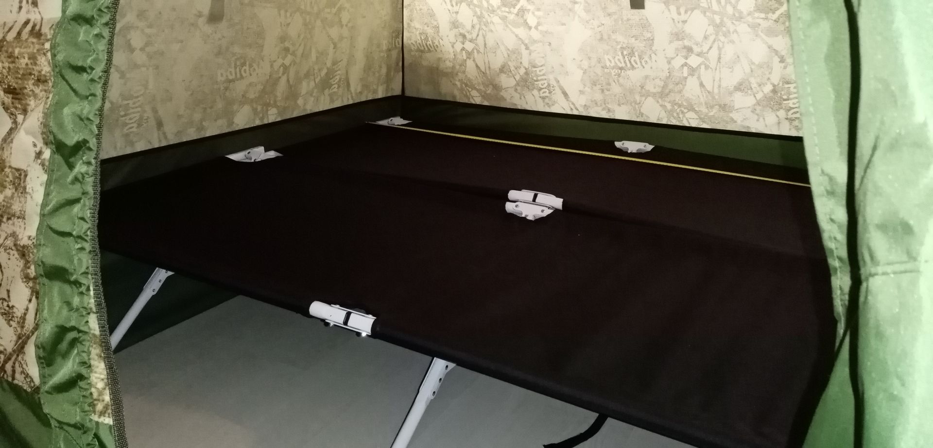 Давайте тоже добавлю в тему о внутренних размерах палатки. При моем росте 174, по середине стою во весь рост. Если у кого была мысль поставить пару кроватей, можно но плотно. На фото две кровати из ленты, аналог кровати медведь и им подобных. Длина кровати 190 ширина 70. По ширине остаётся под печь 45 см.