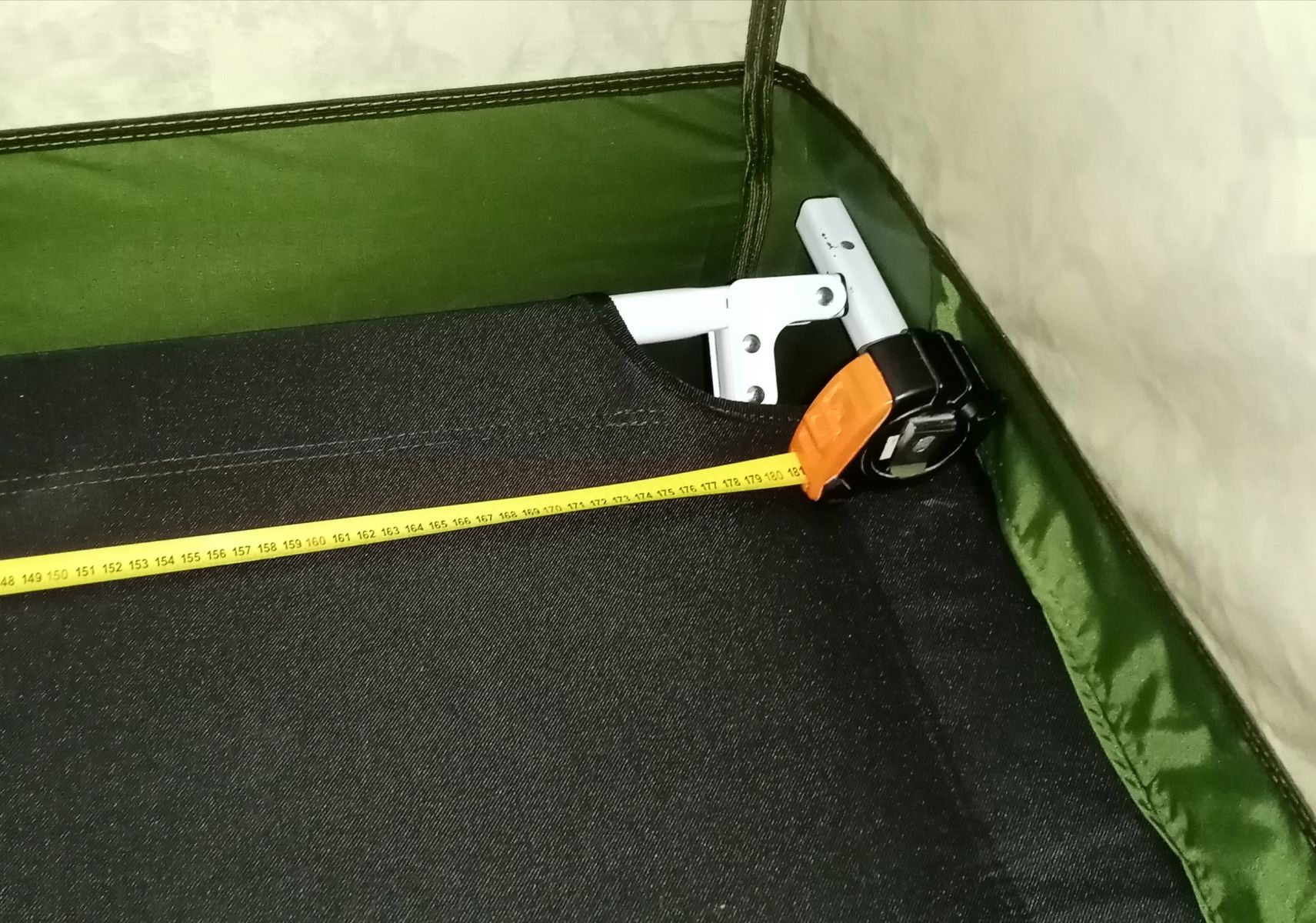 Давайте тоже добавлю в тему о внутренних размерах палатки. При моем росте 174, по середине стою во весь рост. Если у кого была мысль поставить пару кроватей, можно но плотно. На фото две кровати из ленты, аналог кровати медведь и им подобных. Длина кровати 190 ширина 70. По ширине остаётся под печь 45 см.