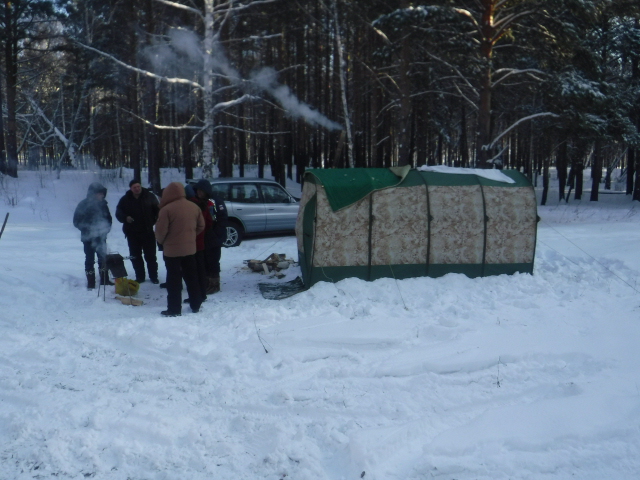 У нас навалило снегу, и в этот раз было относительно тепло -19..-22. Выбрали поляну в лесу, почистили снег и установили палатку. Толпой это происходит быстро и не напрягаясь. Баню решили не делать, т.к. на следующий день планировали париться в стационарной у товарища. Посидели душевно всемером в тёплом домике на свежем воздухе с 11 до 23 часов. Повспоминали прошедший рыбацкий сезон, поделились планами на следующий. Оценили под коньячок сагудай из ленка и хариуса. Дважды жарил на Шикардосе вырезку свиной шеи, ну а товарищ сделал в казане на том же Шикардосе обалденный плов. Забыл допкрышу к 104-й. Проверено, что с ней хоть ненамного, но теплее. За 12 часов Согра съела мешок дров, приточка на диске открывалась на одну треть - только тогда в палатке устанавливается комфортное тепло.