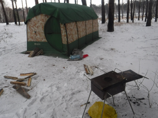 У нас потеплело -14. Сделать прорубь на близлежащих озёрах - надо убить полдня, поэтому мы в лес, на нашу поляну. Друг мой Александр, рыбак и охотник, возглавляет в Ачинске комбинат по добыче алюминия и приезжает на родину раз в три месяца. Мы одноклассники и дружим более 30 лет. Коротко надо заметить, что это человек недюжинной физической силы (меняет колесо без домкрата, плывёт кролем 2 км, тянет канат на чемпионате России и прекрасно чувствует себя в своём 140-килограммовом теле). Обожает баню и особенно Мобибу. Кстати, Александр зарегистрирован у нас на форуме и следит за отчётами и новинками. Именно он летом разогнал мою МБ-10 до 140 градусов летом и сидел в ней полчаса, что никто не мог даже зайти. Каждый его приезд мы топим Мобибу на природе. И этот раз не стал исключением.
