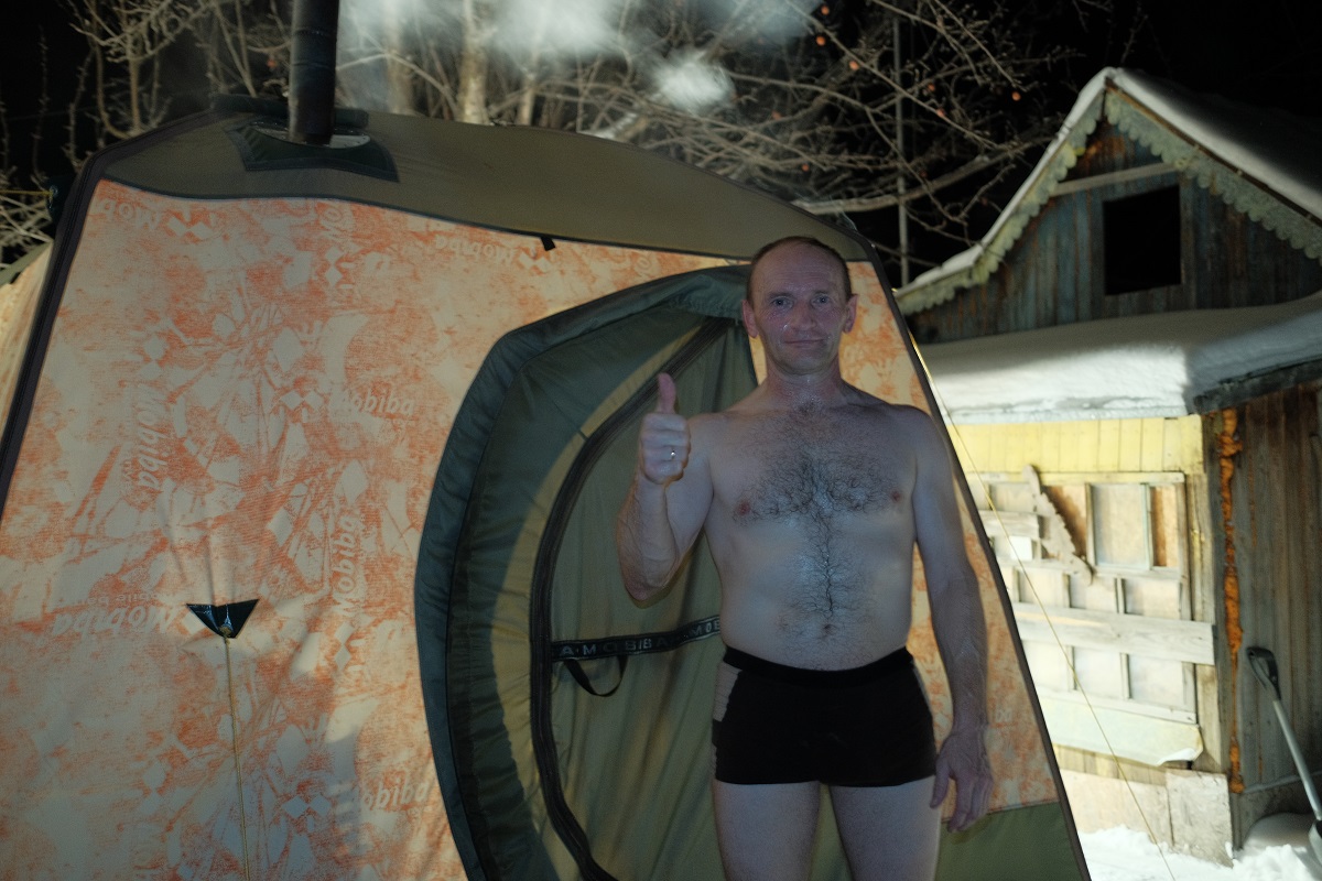 Самый геморр это конечно сворачивание баньки, как только дровишки прогорели, очень быстро палатка и тент замерзли, уложить их штатно не реально, пришлось скатать в комок и тащить домой на отогрев и просушку.