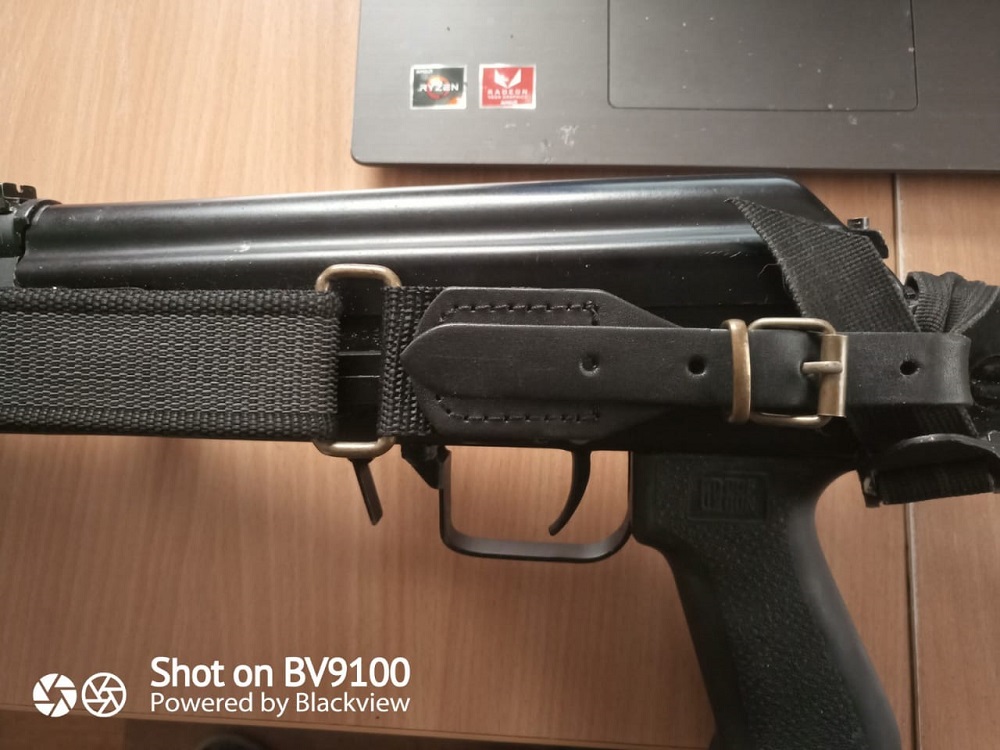 Почему именно такой? Потому, что, во-первых, он с силиконовым покрытием, а значит, не скользит по одежде и снаряжению при переноске. Во-вторых, потому, что вместо привычных для армейских оружейных ремней карабинов, он снабжен кожаными ремешками, что исключает лишнее «блямканье» снаряжения, столь характерное для армейского оружия и столь неуместное для оружия охотничьего.