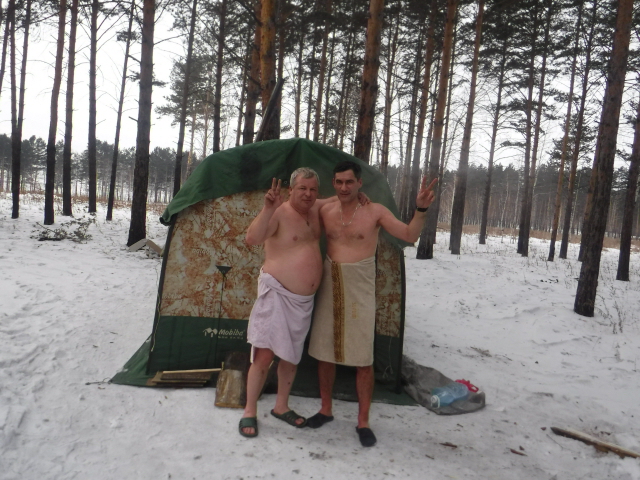 У нас потеплело -14. Сделать прорубь на близлежащих озёрах - надо убить полдня, поэтому мы в лес, на нашу поляну. Друг мой Александр, рыбак и охотник, возглавляет в Ачинске комбинат по добыче алюминия и приезжает на родину раз в три месяца. Мы одноклассники и дружим более 30 лет. Коротко надо заметить, что это человек недюжинной физической силы (меняет колесо без домкрата, плывёт кролем 2 км, тянет канат на чемпионате России и прекрасно чувствует себя в своём 140-килограммовом теле). Обожает баню и особенно Мобибу. Кстати, Александр зарегистрирован у нас на форуме и следит за отчётами и новинками. Именно он летом разогнал мою МБ-10 до 140 градусов летом и сидел в ней полчаса, что никто не мог даже зайти. Каждый его приезд мы топим Мобибу на природе. И этот раз не стал исключением.