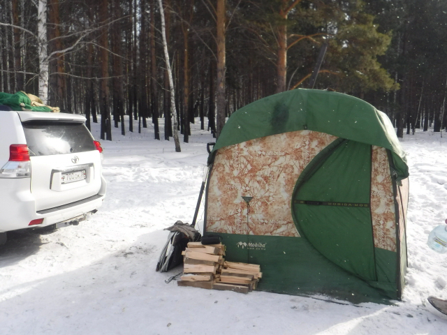 У нас потеплело -14. Сделать прорубь на близлежащих озёрах - надо убить полдня, поэтому мы в лес, на нашу поляну. Друг мой Александр, рыбак и охотник, возглавляет в Ачинске комбинат по добыче алюминия и приезжает на родину раз в три месяца. Мы одноклассники и дружим более 30 лет. Коротко надо заметить, что это человек недюжинной физической силы (меняет колесо без домкрата, плывёт кролем 2 км, тянет канат на чемпионате России и прекрасно чувствует себя в своём 140-килограммовом теле). Обожает баню и особенно Мобибу. Кстати, Александр зарегистрирован у нас на форуме и следит за отчётами и новинками. Именно он летом разогнал мою МБ-10 до 140 градусов летом и сидел в ней полчаса, что никто не мог даже зайти. Каждый его приезд мы топим Мобибу на природе. И этот раз не стал исключением.
