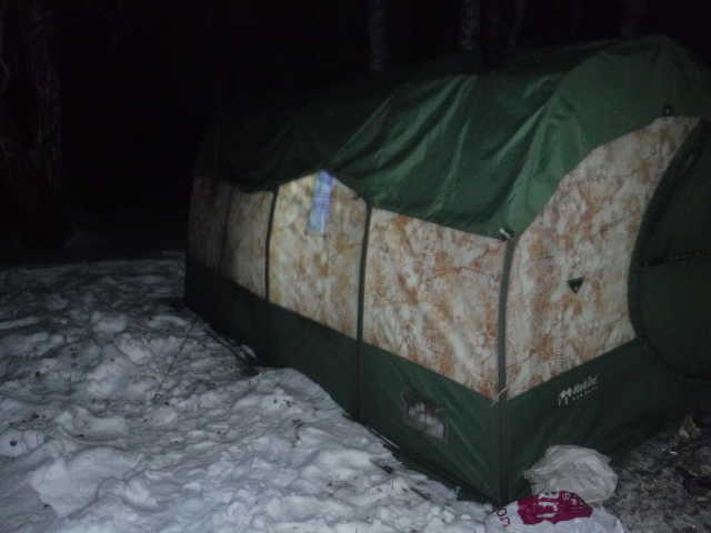 Темнеет рано, и перед самой темнотой Олег берёт пару неплохих хариусов. Убираем перегородку, Медиана мгновенно высушивает палатку так, что даже листья с берёзовых веников не успевают отлететь со стен. Выносим печь, ставим кровати, набиваем Согру топливом. Всё, теперь можно и посидеть душевно за рюмкой чая. Таёжный супчик сварен. На завтра обещали солнечную погоду, решаем сменить снасть. Обсуждаем печи и двухслойные палатки Мобибы. Хочется всё, но у всех кризис, отец его.. На этом повествование можно было и закончить, всё на этот момент было просто замечательно. Но парни забыли с кем поехали, ведь я последнее время просто притягиваю к себе неприятности. К 24 часам (пятница, 13-е) резко похолодало. Было -12 градусов, стало -21. Упало давление и Согра впервые в жизни потухла(!). Виной всему сырая напиленная берёза. Это сразу почувствовалось в палатке. Осталась пара-тройка карандашей Пиникея. Разломил, смешал с берёзой. Тут же вышла из строя насадка на газовый балон, вторая тоже отказалась работать. Тем не менее, Согру взбодрили и больше она сюрпризов не преподносила.