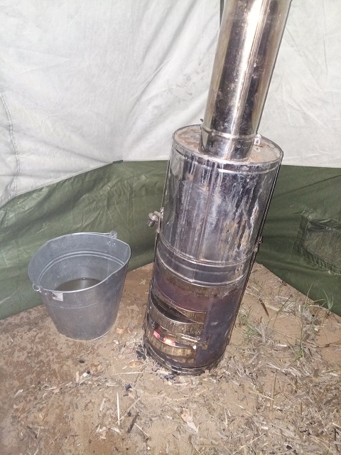 Хотя я и привык, при росте 185, париться "враспорочку", раздвигая собой стенки палатки, в этот раз я (прямо бунтовщик какой-то!) отодвинул полок от стены и поставил чуть по диагонали. Ноги - к печке, голова - ближе к выходу. Ванночка с веником - под полоком, обоеручно досягаема. Ну и всё... Берешь веник левой рукой (что вдоль стенки) - помахал - погрелся. Потом правой рукой. Техника соло-парения, думаю, на форуме описана? Для паренья вдвоем нужен очень аккуратный банщик. Т.к. влажный пар, очень сильная отдача температуры за счёт конденсации - очень аккуратно надо веничком. Впрочем, это я в дебри науки полез куда-то, а вот дотерпеть этот жесткий пар, вылезти из бани, протопать до проруби незамерзающей...