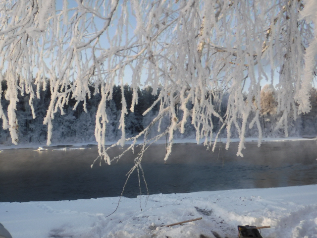 Расчищаем снег, никуда не торопясь, ставим палатку и печи. Трубы у Согры и Медианы я меняю каждый раз, тогда совсем нет нагара, достаточно лишь слегка обстукать. Лёгкий перекус, мужики разбредаются по реке со спиннингами, а я занимаюсь дальнейшим обустройством лагеря. С собой две сухих лиственичных чурки и брикет Пиникеев - это пойдёт на баню, на Согру приходится напилить Штилём из того, что есть в лесу. К обеду теплеет до -12, мы затопляем баню и до темноты паримся в ней, после каждого захода окунаясь в реку. Впечатления непередаваемые. Ради этого стоило ехать.