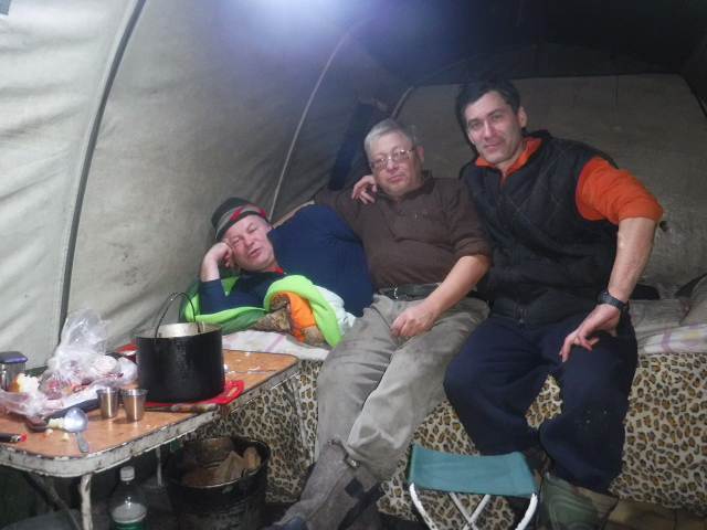 Темнеет рано, и перед самой темнотой Олег берёт пару неплохих хариусов. Убираем перегородку, Медиана мгновенно высушивает палатку так, что даже листья с берёзовых веников не успевают отлететь со стен. Выносим печь, ставим кровати, набиваем Согру топливом. Всё, теперь можно и посидеть душевно за рюмкой чая. Таёжный супчик сварен. На завтра обещали солнечную погоду, решаем сменить снасть. Обсуждаем печи и двухслойные палатки Мобибы. Хочется всё, но у всех кризис, отец его.. На этом повествование можно было и закончить, всё на этот момент было просто замечательно. Но парни забыли с кем поехали, ведь я последнее время просто притягиваю к себе неприятности. К 24 часам (пятница, 13-е) резко похолодало. Было -12 градусов, стало -21. Упало давление и Согра впервые в жизни потухла(!). Виной всему сырая напиленная берёза. Это сразу почувствовалось в палатке. Осталась пара-тройка карандашей Пиникея. Разломил, смешал с берёзой. Тут же вышла из строя насадка на газовый балон, вторая тоже отказалась работать. Тем не менее, Согру взбодрили и больше она сюрпризов не преподносила.