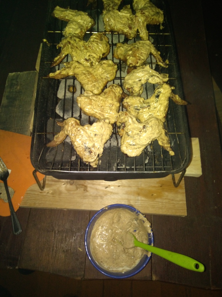 В выходные приезжал друг на дачу, специально попариться в К5+КЦ-4. Заодно решил приготовить крылышки-гриль по-Сычёвски. Выше был выложен этот рецепт. В связи с тем что у меня нет Шикардоса крылышки были приготовлены в древнем восстановленном гриле с отсутствующим регулируемым поддувалом, но зато с крышкой. Шеф так вкусно расписывал сам процесс приготовления что я не дотерпел до выходных и первый раз приготовил дома в духовке. Но всё по порядку. Сам процесс- крылышки не мариновались, сразу снял стрейч плёнку с пластиковой подложки и выложил крылышки на решётку. Угли были круглые прессованные, уже разгоревшиеся. Крылышки запекались (запечатывались при большой температуре) и под крышкой и без крышки. Первый раз, ветер, древний гриль, поэтому я экспериментировал. Когда мясо побелело и я понял что оно готово я перевернул крылышки. Потом густо обмазал их "мазиловкой". Закрыл крышкой, "мазиловка" загустела на крылышках и перевернул их и обмазал уже эту сторону. Так же прикрыл крышкой на несколько минут, до ссватывания "мазиловки". Потом подержал чуть чуть на жарких углях с открытой крышкой и сложил в глиняный горшочек. Далее про этот же рецепт с моей вариацией: