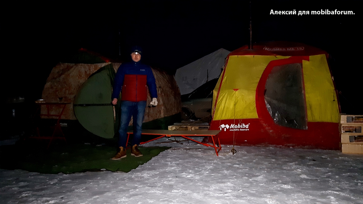 Я поехал один на озеро Бисерово (1км.от ЖД станции Купавна). В 23.00 затопил баню и вырубил 2 проруби( первая чуть выше колен, вторая по грудь). Парился до часу ночи. Народу было мало. Все искали оборудованную прорубь, с освещением, лестницей и МЧС. Прыгать в ночи в черный квадрат во льду желающих было не много. Приглашал всех зайти погреться в МБ-10, а потом в прорубь. Самое интересное что заходили греется только девушки,а их парни даже не собирались купаться. Ещё один парень остался со мной до конца и помог свернуть баню. После 3-4 заходов сказал: "так хорошо что ноги не держат". :D Это нормальное состояния, так всегда с Мобибой!!!