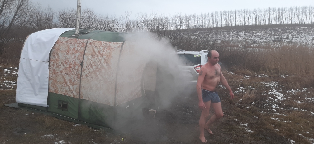 Моросил дождь, в первый день так дождь со снегом. Баннер один был, одну часть бани накрыл им.
