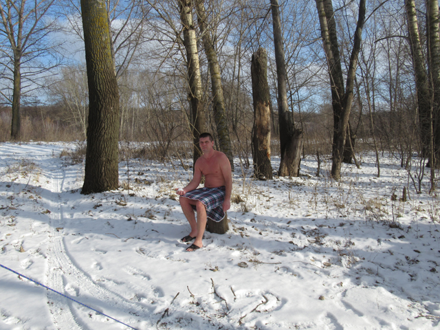 Банный зимний день начинается рано, чтобы захватить светлое время. От момента приезда до того, как мы ложимся на полки уходит час с четвертью и точка. Первый раз греимся без фанатизма и перерыв. Второй раз закладываю полную топку и ложимся «лапки к верху». Минут через пять начинаю поливать на каменку заварку трав для аромотерапии и ингаляции. Через 10 минут температура на уровне полков уже около 60ºС – это для жены достаточно. На голову кладу эвкалиптовый и берёзовый веники, чтобы легче дышалось. Начинаю с бамбукового веника, потом в ход идут березовые и дубовые 10 – 15 минут. Технику парения познаю из нета, конечно после «Форума». Информации много, глотаю всё, в голове правда пока каша. Итого: 20 – 25 минут, обмываемся, задвигаю зольник, расстёгиваю молнию на двери, в результате чего температура падает до 25 – 30ºС и перерыв на пол часа. Пъём заварки из термосов, воду из родника, несколько раз понравился квас, но зимой проблема найти хороший – раза три точно просто вылил. Третий заход мой. После повышения температуры 60ºС жена спускается на скамейку, а ноги на полке. Температура ещё поднимается до 70ºС и у меня начинается практика техники самопарения, при этом часто поддаю на каменку из таза, где замачиваются веники. Заметил то, что когда закипает вода в баке дышать становится хуже, но тогда просто подливаю холодной воды. Опять минут 20-25, Татьяна внизу успевает наскрабиться. Обмываемся и я в реку. В снегу поваляться этой зимой не удалось. Один раз что-то было: лёг на снег, а он подомной расстаял, встал весь в листьях.