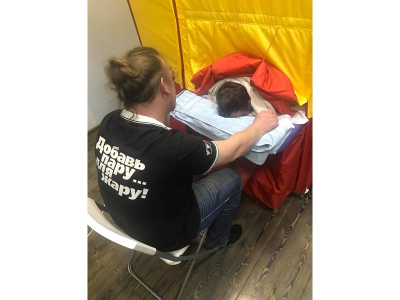 8. Человек которого парят ложиться на полок, накрывает голову полотенцем и дышит воздухом прямо из трубы.