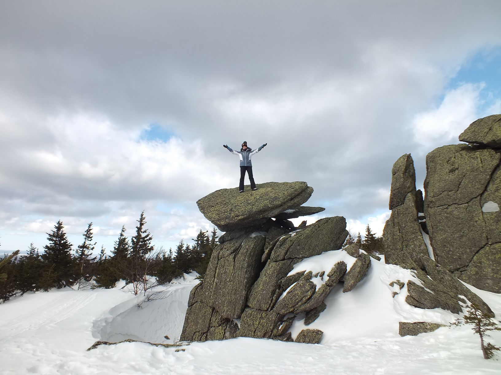 Переодевшись в сухие вещи, перекусив, мы одевшись потеплее пошли гулять по плато. На вершине всегда дуют ветра и создают причудливые рисунки на снегу, а местами снег вообще отсутствует. Шли мы сюда чтоб увидеть и сфотографировать причудливый скальный выступ, с определенного ракурса напоминающий кепку, его еще называют "Кепка вождя". Побродив по окрестностям мы его нашли и сфотографировались.