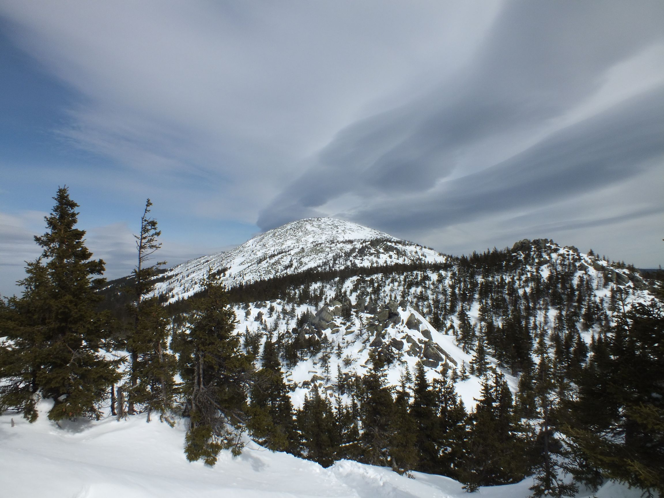 Побродив у "Трех братьев", устроили импровизированный пикник. Погода начала немного портится, налетели тучи и мы с радостью водрузив рюкзаки-грелки на спину, двинулись дальше. Переночевав в приюте "Таганай" мы пошли по нижней тропе на выход из парка. По пути посмотрели на "Большую каменную реку", но зимой она не так величественна, потому как занесена снегом.