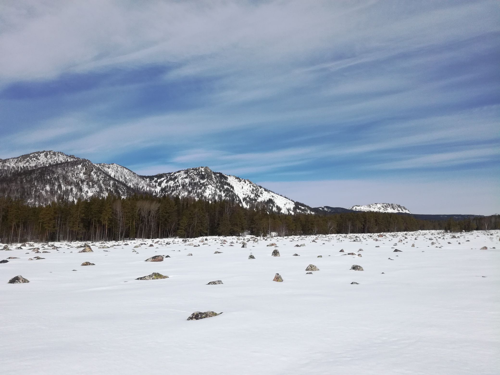 Побродив у "Трех братьев", устроили импровизированный пикник. Погода начала немного портится, налетели тучи и мы с радостью водрузив рюкзаки-грелки на спину, двинулись дальше. Переночевав в приюте "Таганай" мы пошли по нижней тропе на выход из парка. По пути посмотрели на "Большую каменную реку", но зимой она не так величественна, потому как занесена снегом.