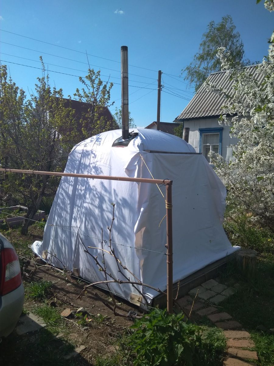 Судя по всему карантин на долго и летом вряд ли получится куда-то выехать с баней. Поэтому поставил десятку на лето стационарно и укрыл от солнца баннером
