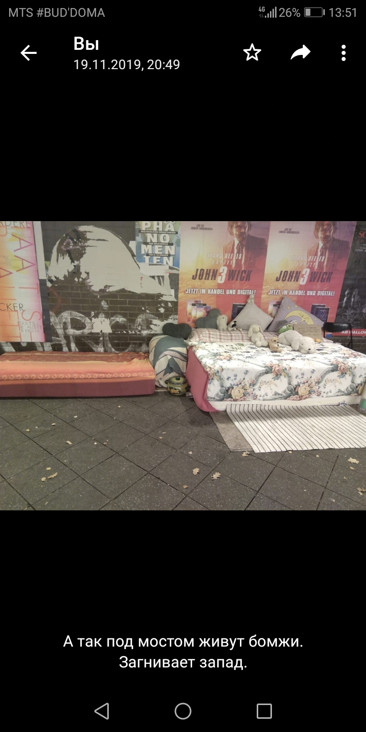 Александр, идеальных государств не бывает. Задача правительства поддерживать уровень проживания граждан на определённом уровне. Чем выше, тем лучше. Но естественно не на уровне шейхов. С другой стороны сравни уровень зарплат, возможностей, инфраструктуры в нашей стране, по сравнению с тем временем, когда Ельцин сказал- я мухожук, я ухожу. В декабре был с семьёй в Берлине. Страна-лидер Евросоюза. Так ни в какие подмётки, мне как обывателю, ни в какое сравнение ни с Москвой, ни с другими нашими городами не сравнить. И на велосипедах они там массово ездят не от любви к спорту, а от своего нищебродства (зачёркнуто) от дороговизны. Билет в одну сторону на 2 часа, на общественном транспорте стоит от 154,7 руб. В метро висят провода, стены не отделаны, граффити, на улицах вообще не метут. А это бомжи под мостом, в центре Берлина Короче, жизнь не сахар и ещё неукоснительное исполнение закона. А у нас строгость законов, не подразумевает их исполнение. Вот если бы в этой группе товарищей был хотя бы один больной короной и заразил всех остальных? Кто бы был виноват? Государство, которое не так предупреждало? Моя семья и родные сидят строго на карантине, выезд только в магазин, по пропуску. Чаще всего это я, без пассажиров, с большим списком. Зато местные раскатывают каждый день в магазин. Я видел как они по паре пакетиков корма для кошки покупают. Никакого соблюдения самоизоляции, а потому что жареный петух в ж...у не клюнул. И это я про соседей пенсионеров. Так же и по лесным пожарам, не верю я что происходит самовозгорание из-за битого стекла. Рукотворное всё это. И кстати, ленка я не ел вообще ни разу в жизни. А хочется.AlexL писал(а):На неделе оштрафовали моих знакомых, стоящих компанией на реке. Ни за водоохранную зону, ни за нарушение пожароопасного режима, а именно за нарушение режима самоизоляции (злостное).