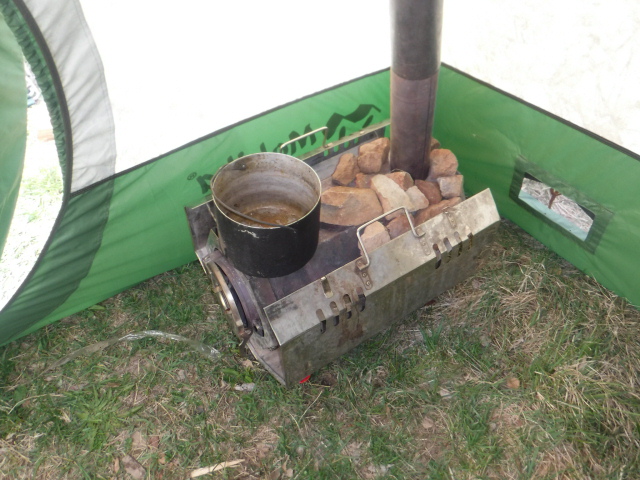 Знали, что в ночь будет дождь, вернее даже ливень по прогнозу. Взял допкрышу от 104-й. Подвязать второй слой на "попки" гораздо проще, чем на молнии у десятки. С установкой Согры пришлось немного поколдовать. Пробовали даже установить у левой стены от входа, но тогда подбрасывать в печь неудобно и большой ПСН-700 не встаёт. В итоге установили у фронтальной стены, но при этом сдвинув печь макимально возможно влево. Приличный наклон дымохода имеет место быть, но всё работает нормально. Из-за низкого потолка и меньшего объёма парилки Согра с жадеитом выдаёт в РБ-200 примерно столько, сколько Медиана в парилке МБ-104. Получается ещё один хороший универсальный комплект. При +6..+8 на улице, жару в парилке хватило нам с избытком. Думаю, зимой при утеплении пола тоже потянет. Напарились, накупались, затем вынесли полок. Умудрились установить в палатке с печкой столик и два пластиковых кресла. Только начали варить суп на Согре - пошёл дождик. К 23 часам он превратился в ливень, в полночь казалось, что на палатку кто-то льёт из огромного душа. Улеглись в час ночи и спали до 8 утра. В палатке было тепло и сухо. Тлеющего режима Согры при 3-4 градуса тепла на улице хватило с избытком. Дождь так и не прекратился, поэтому в 10 утра пришлось собирать наш скромный лагерёк. Теперь по расположению раскладушек и ночёвке. Две больших, типа "Медведя" точно с печью не войдут. Обычные кемпинговые с трудом. Дело в том, что ветровые оттяжки на стенах, в отличие от той же десятки расположены высоко и на уровне колена (высоты раскладушек) палатка практически не растягивается. Вариант - ПСН-700+раскладушка, как мы иногда практиковали в десятке, тоже не подходит из-за более покатых стенок палатки. А вот две подростковых 185х55 встали легко. Кусочек видео (фотик сел в самый неподходящий момент)