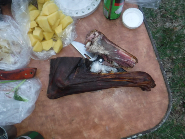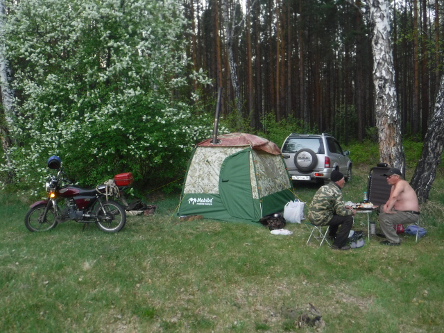 Знали, что в ночь будет дождь, вернее даже ливень по прогнозу. Взял допкрышу от 104-й. Подвязать второй слой на "попки" гораздо проще, чем на молнии у десятки. С установкой Согры пришлось немного поколдовать. Пробовали даже установить у левой стены от входа, но тогда подбрасывать в печь неудобно и большой ПСН-700 не встаёт. В итоге установили у фронтальной стены, но при этом сдвинув печь макимально возможно влево. Приличный наклон дымохода имеет место быть, но всё работает нормально. Из-за низкого потолка и меньшего объёма парилки Согра с жадеитом выдаёт в РБ-200 примерно столько, сколько Медиана в парилке МБ-104. Получается ещё один хороший универсальный комплект. При +6..+8 на улице, жару в парилке хватило нам с избытком. Думаю, зимой при утеплении пола тоже потянет. Напарились, накупались, затем вынесли полок. Умудрились установить в палатке с печкой столик и два пластиковых кресла. Только начали варить суп на Согре - пошёл дождик. К 23 часам он превратился в ливень, в полночь казалось, что на палатку кто-то льёт из огромного душа. Улеглись в час ночи и спали до 8 утра. В палатке было тепло и сухо. Тлеющего режима Согры при 3-4 градуса тепла на улице хватило с избытком. Дождь так и не прекратился, поэтому в 10 утра пришлось собирать наш скромный лагерёк. Теперь по расположению раскладушек и ночёвке. Две больших, типа "Медведя" точно с печью не войдут. Обычные кемпинговые с трудом. Дело в том, что ветровые оттяжки на стенах, в отличие от той же десятки расположены высоко и на уровне колена (высоты раскладушек) палатка практически не растягивается. Вариант - ПСН-700+раскладушка, как мы иногда практиковали в десятке, тоже не подходит из-за более покатых стенок палатки. А вот две подростковых 185х55 встали легко. Кусочек видео (фотик сел в самый неподходящий момент)