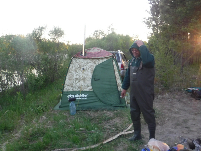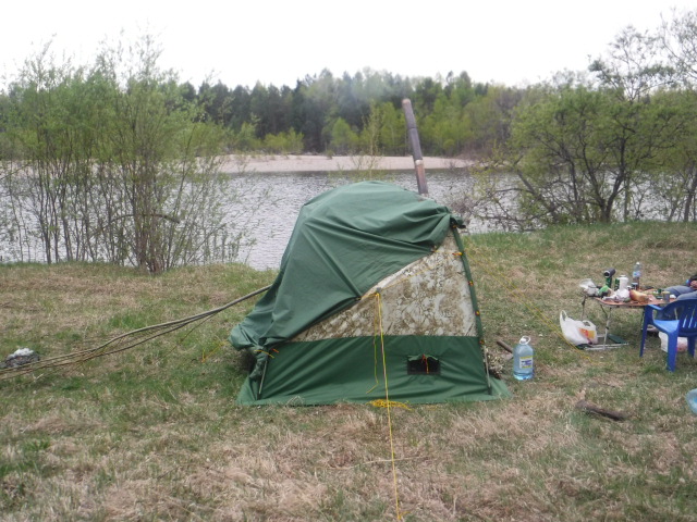 Знали, что в ночь будет дождь, вернее даже ливень по прогнозу. Взял допкрышу от 104-й. Подвязать второй слой на "попки" гораздо проще, чем на молнии у десятки. С установкой Согры пришлось немного поколдовать. Пробовали даже установить у левой стены от входа, но тогда подбрасывать в печь неудобно и большой ПСН-700 не встаёт. В итоге установили у фронтальной стены, но при этом сдвинув печь макимально возможно влево. Приличный наклон дымохода имеет место быть, но всё работает нормально. Из-за низкого потолка и меньшего объёма парилки Согра с жадеитом выдаёт в РБ-200 примерно столько, сколько Медиана в парилке МБ-104. Получается ещё один хороший универсальный комплект. При +6..+8 на улице, жару в парилке хватило нам с избытком. Думаю, зимой при утеплении пола тоже потянет. Напарились, накупались, затем вынесли полок. Умудрились установить в палатке с печкой столик и два пластиковых кресла. Только начали варить суп на Согре - пошёл дождик. К 23 часам он превратился в ливень, в полночь казалось, что на палатку кто-то льёт из огромного душа. Улеглись в час ночи и спали до 8 утра. В палатке было тепло и сухо. Тлеющего режима Согры при 3-4 градуса тепла на улице хватило с избытком. Дождь так и не прекратился, поэтому в 10 утра пришлось собирать наш скромный лагерёк. Теперь по расположению раскладушек и ночёвке. Две больших, типа "Медведя" точно с печью не войдут. Обычные кемпинговые с трудом. Дело в том, что ветровые оттяжки на стенах, в отличие от той же десятки расположены высоко и на уровне колена (высоты раскладушек) палатка практически не растягивается. Вариант - ПСН-700+раскладушка, как мы иногда практиковали в десятке, тоже не подходит из-за более покатых стенок палатки. А вот две подростковых 185х55 встали легко. Кусочек видео (фотик сел в самый неподходящий момент)