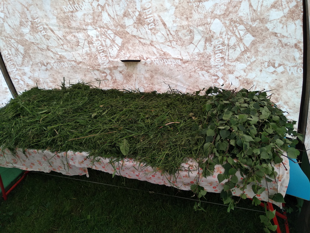 Дальше в палаточку полок, на него туристическую пенку, закрепленную на резинки для крепления грузов с карабинами, сверху простынки. Резал веники свежие и зажмотил обрезки выбросить. Соорудил из них подушку, застелил свежескошенной трывы и накрыл этот пирог простыней. Ложе императоров получилось. На фотке виден мешочек "Банные штучки". Это у меня был сертификат и его куда-то нужно было. Вот и взял эти штучки и ступку на для аромамасел на камни. Там в мешочке камушки для стоунотерапии. Новые они черные такие красивенькие. Я их прокипятил и оказались они обычными серыми гладышами. Тех денег, что за них просят они не стоят однозначно. Девченки побаловались. Им понравились камушки. Ступка класная. Мы в нее настойку амоля, разведенного с горячей водой лили. Иногда у нас просто гейзер получался. Очень зрелищно. Ну и аромат конечно.