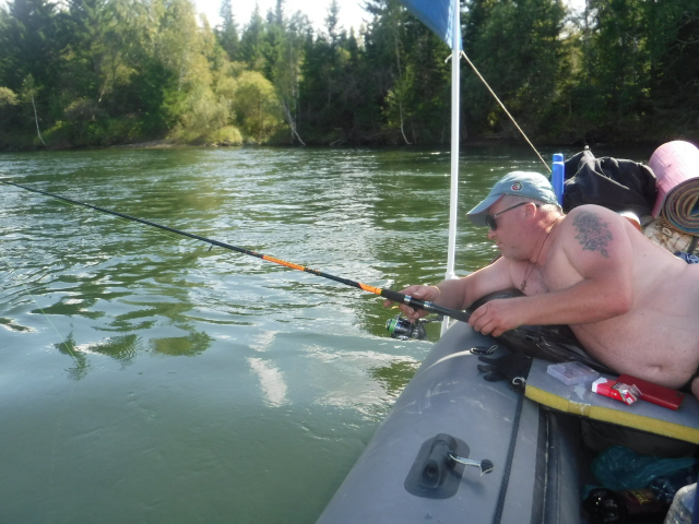 Лодка Братан Тунгуска 500. Пятьсот - это и длина, и грузоподъёмность. В общем по весу мы в аккурат вписались. Две палатки, стол, стульчики, раскладушки, спальники, снасти, Согра, 10 кг жадеита, три тела по 80, 100 и 120 кг. К электромотору мы, наконец, приобрели гелевый аккумулятор. Всё вошло, а при грамотном распределении груза в лодке ещё оставалось место. Онотский мост В 18.00 встали на первую ночёвку. Разгрузились, установили лагерь. Порыбачили. Баню не топили, только просушились на Согре. У товарища на хайрюзовый настрой хватанул леночек - это редкость. Весь улов первого дня. День второй Первый населённый пункт на пути - крошечная деревушка Большебельск. Ватерснейк 28 мощностью 0,5 киловатт бесшумно молотил на 1-2 скорости 3 дня и вёслами мы практически не пользовались. Остановка для фотосессии Второй день рыбалки почти не было Проходим наш любимый песчаный пляж, куда мы часто ездим - он почти затоплен Заброшенный дом отдыха "Ёлочки". Местный предприниматель выкупил его лет 10 назад, но он так и не заработал. На вторую ночёвку причалили уже поздно, поэтому баню топили по темноте. Третий день с утра порадовал нас солнышком, но стоило загрузиться и отплыть, налетел встречный ветер. Тент стал парусом, и лодка отказывалась плыть даже по течению, а на электромоторе шла 2-3 км в час. Высадили аккумулятор до конца.
