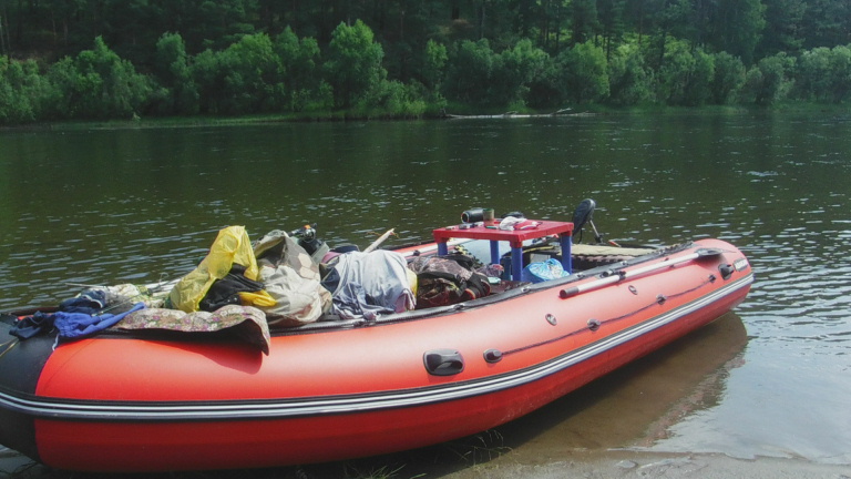 На фото тент после сильного ветра - погнулся, но выдержал. Через недельку планируем вшестером на двух лодках. Уже надо будет брать 104-ю.