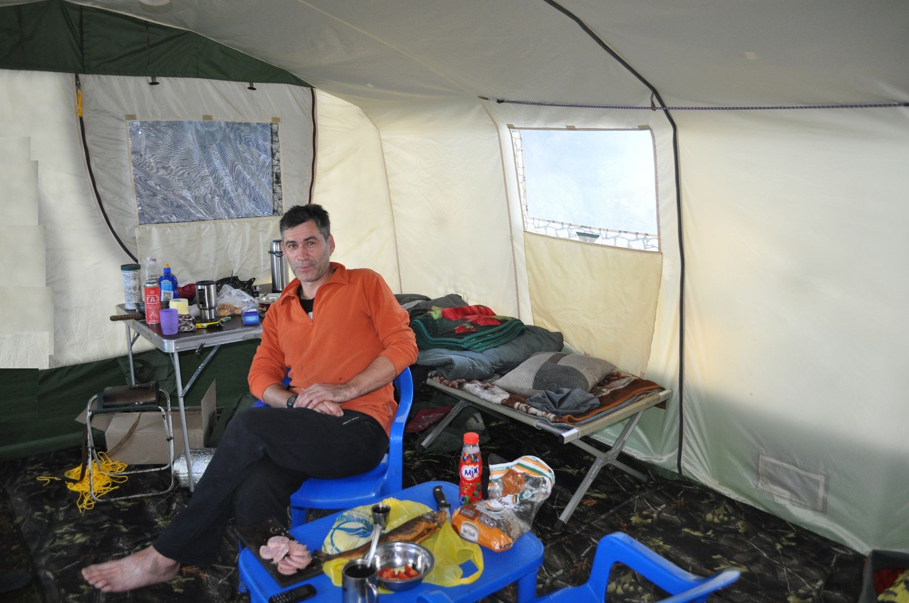 Ветер с Байкала усиливается настолько, что внутренний и внешний тент с правой стороны слипаются. Денис, как человек ходящий под парусом, фиксирует 15-20 м/сек. Устанавливаем все растяжки с ветренной стороны.