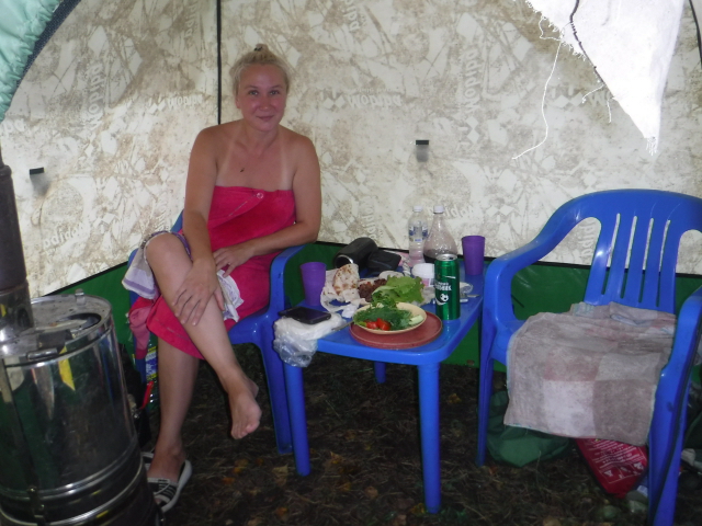 То ли давление низкое, то ли температура с дождиком максимально возможная для Жиги, но мне не хватило. Топить умею, приход выжидал, импульс ловил. Надо было Согру брать. Тент или даже пара одеял повысили бы банные кондиции, но мне хотелось узнать, где граница именно в штатном варианте. Супруге хватило, мне нет, даже камни не спасли положение. Зато классно посидели после бани в тепле, когда за окном моросил дождик.