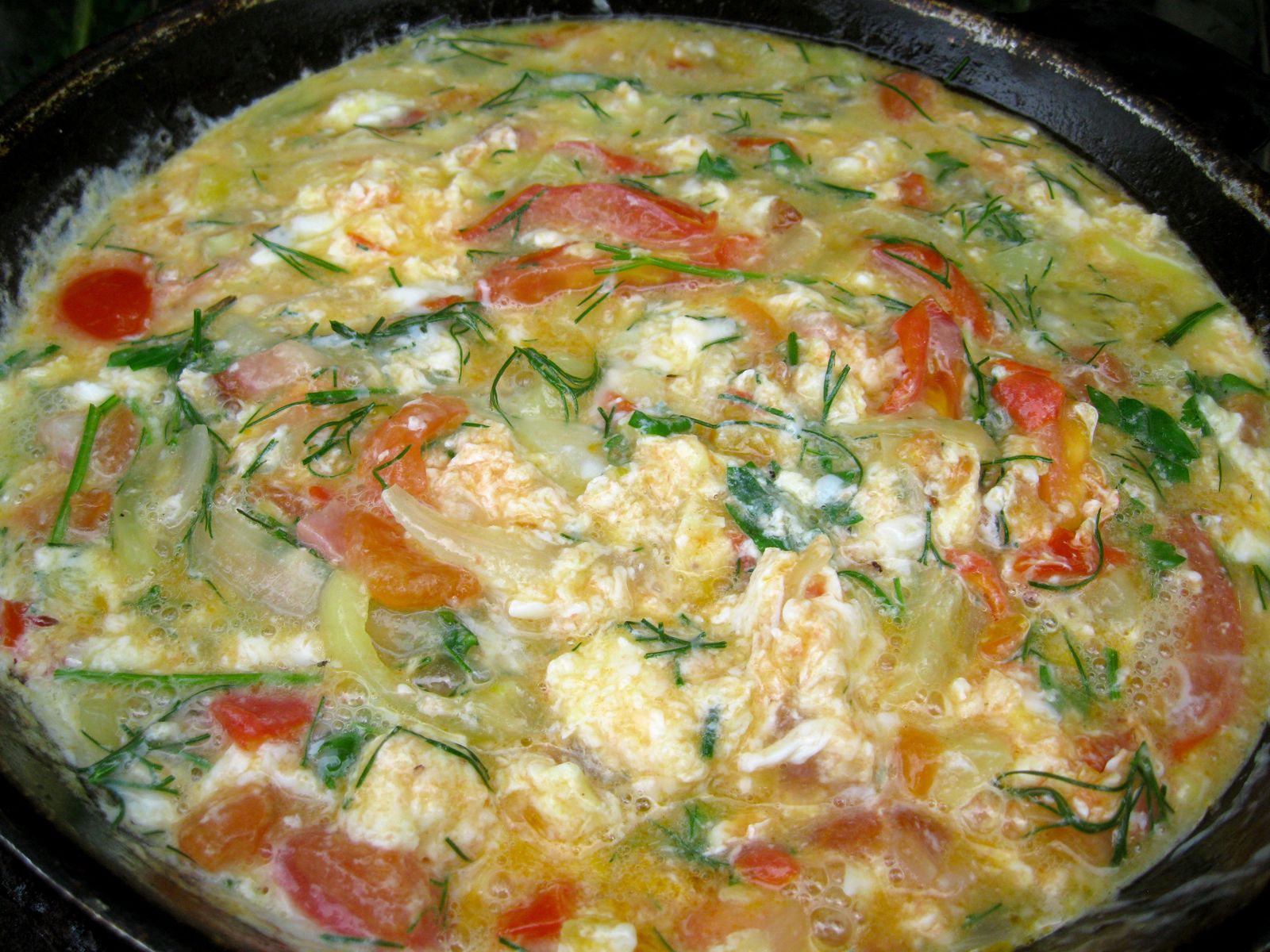 Завтрак туриста получился из полкило овощей, + шкварочки, и десятка яиц. Под легкий допинг в два лица провалилось, даже не заметили. )))