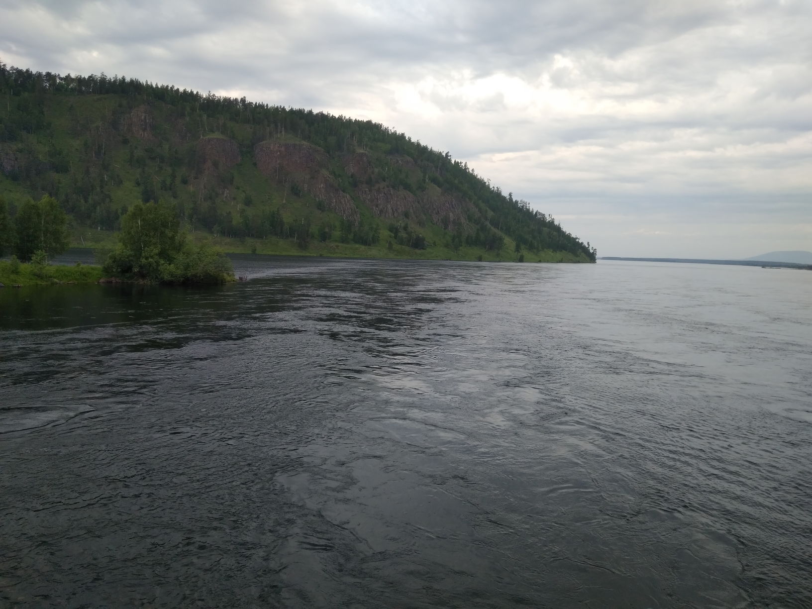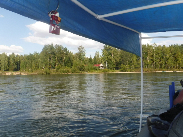 Лодка Братан Тунгуска 500. Пятьсот - это и длина, и грузоподъёмность. В общем по весу мы в аккурат вписались. Две палатки, стол, стульчики, раскладушки, спальники, снасти, Согра, 10 кг жадеита, три тела по 80, 100 и 120 кг. К электромотору мы, наконец, приобрели гелевый аккумулятор. Всё вошло, а при грамотном распределении груза в лодке ещё оставалось место. Онотский мост В 18.00 встали на первую ночёвку. Разгрузились, установили лагерь. Порыбачили. Баню не топили, только просушились на Согре. У товарища на хайрюзовый настрой хватанул леночек - это редкость. Весь улов первого дня. День второй Первый населённый пункт на пути - крошечная деревушка Большебельск. Ватерснейк 28 мощностью 0,5 киловатт бесшумно молотил на 1-2 скорости 3 дня и вёслами мы практически не пользовались. Остановка для фотосессии Второй день рыбалки почти не было Проходим наш любимый песчаный пляж, куда мы часто ездим - он почти затоплен Заброшенный дом отдыха "Ёлочки". Местный предприниматель выкупил его лет 10 назад, но он так и не заработал. На вторую ночёвку причалили уже поздно, поэтому баню топили по темноте. Третий день с утра порадовал нас солнышком, но стоило загрузиться и отплыть, налетел встречный ветер. Тент стал парусом, и лодка отказывалась плыть даже по течению, а на электромоторе шла 2-3 км в час. Высадили аккумулятор до конца.
