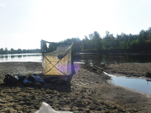 На выходных ездил на Ангару попариться. Был разочарован тем что в том месте где я ставлю баню все дно заросло какими-то водорослями, причем сплошником. Весной еще и намека не было, а в прошлом году вообще не было, пришлось нырять в мутное озерцо поблизости. Ездил с ночевой, в первый день не парился, но подтопил немного печь чтобы нагреть камни и воду в баке, чтоб они ночью меня грели, боялся что из-за дождя будет холодно. Под потолком температура держалась около 40, ночью не топил. Спал как "убитый". Рядом с лагерем стоял еще лагерь, народ был удивлен такой баней и попросились попарится, отказать не смог!) Когда приехал, на берегу рыбачил старичёк, он думал я тоже рыбачить, но я сказал что в бане парится, он немного улыбнулся и спросил а где же тут баня? Я сказал что в багажнике лежит, тут он улыбнулся еще больше, видимо подумал что я над ним подшучиваю, но потом так же был удивлен когда увидел и даже попросил сфотаться рядом с баней. В этот раз я использовал брикеты из Ленты, они дороже местных но при этом и жар дают хороший и горят долго. Хотел снять видео как я поддаю пульвелизатором на камни, но телефон сел. Успел сделать пару фоток местности