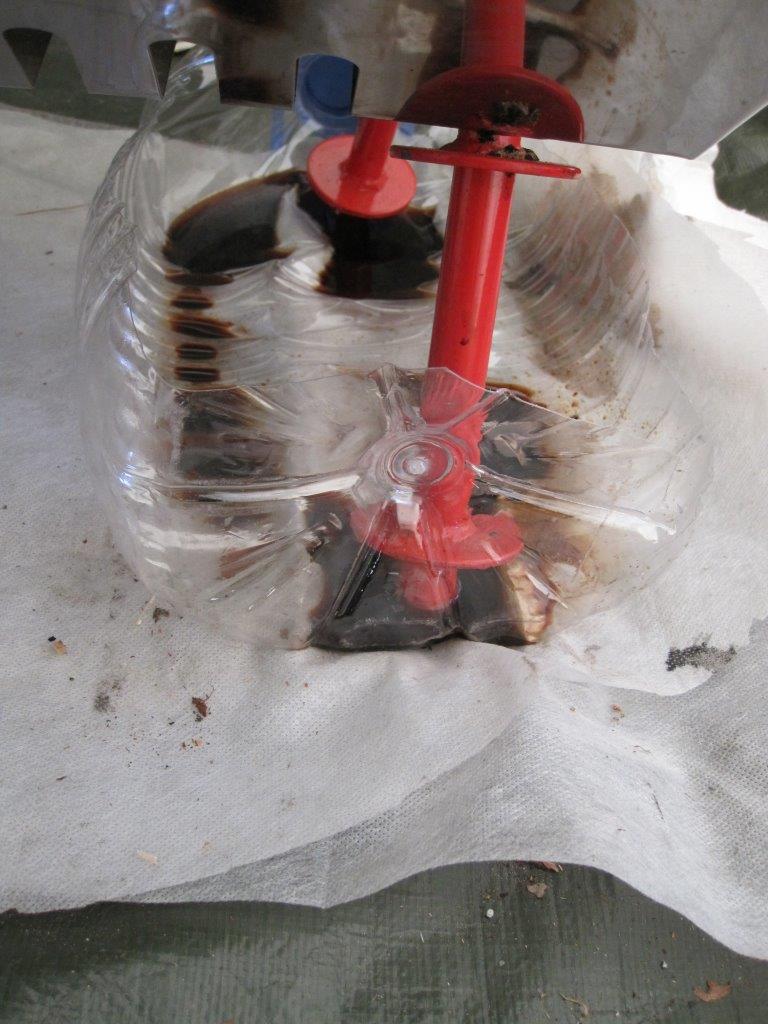 Осмотр показал, что деготь стекал в поддон искрозащитного коврика, а уже из него под коврик. Пропитал весь коврик и остался под ковриком.
