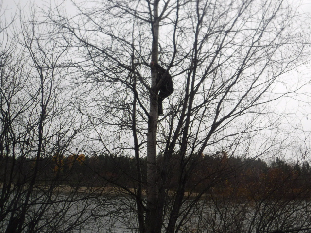 Человек лезет на дерево. Вопрос - зачем? Ответ: отцепить блесну. Так круто забрасывал.