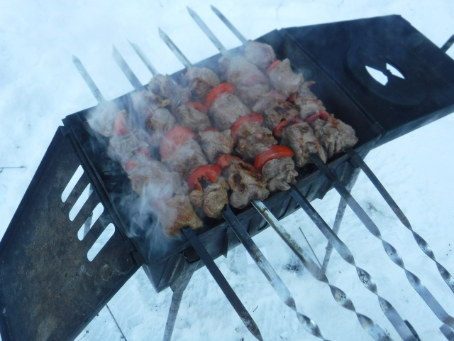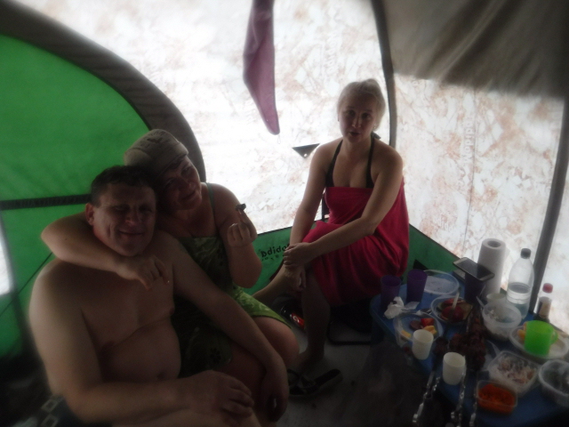 Парились допоздна, мы с товарищем с ночных смен, поэтому особо не усердствовали - зашли за всё время 4 раза. А вот женщины у нас разошлись. Подруга товарища очень любит баню, у них в доме хорошая стационарная, но в Мобибе парилась впервые. Сказала, что в этой парилке очень легко дышится, поэтому можно заходить много раз. Короче, мы сбились со счёту, сколько раз наши женщины парились и купались в снегу. Собирались по темноте, домой прибыли в 23.00.