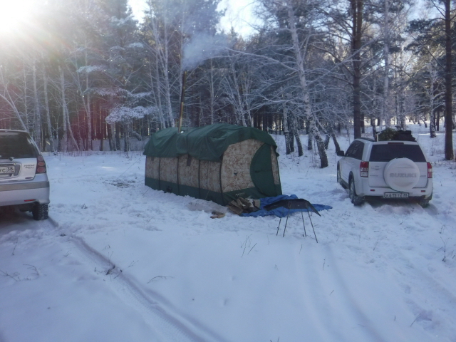 Субботний выезд в лес с баней без ночёвки. Снегу у нас уже достаточно, можно и поваляться. В 10 утра уже были на месте. Не торопясь, за полчаса расчистили снег и установили лагерь. Пока ещё тепло, на улице -10..-12 градусов.