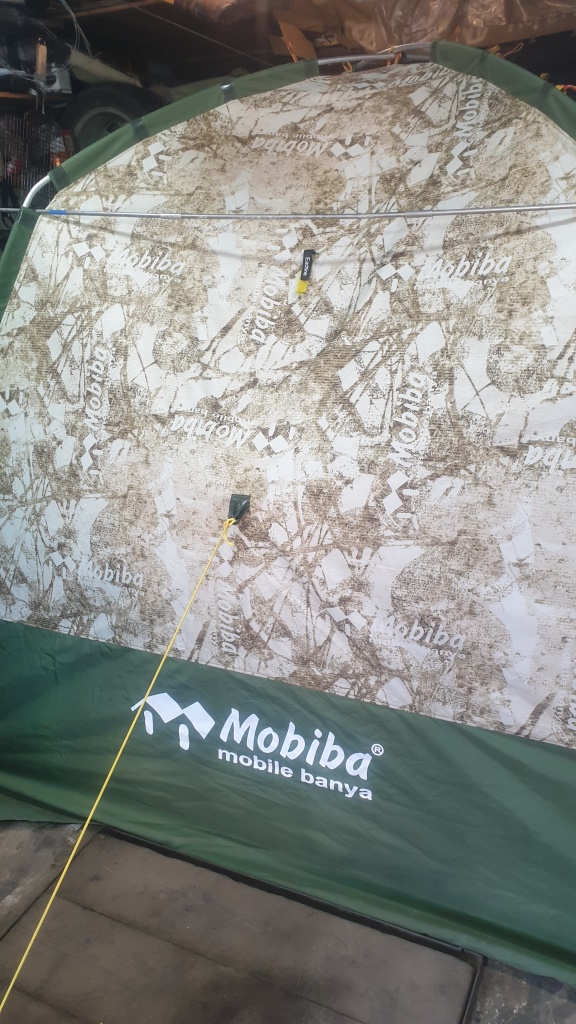 Наслаждаясь банным кайфом в кайфандре я все время ловил себя на мысли, что, сидя но полоке, с завистью смотрю на противоположную стенку. На ту, где печка и дверь... А все дело в том, что она более вертикальная что-ли, чем задняя. При установке палатки на все растяжки и особенно той, что на задней стенке у полока, сама стенка на переходе в курышу как бы деформируется вовнутрь. Уменьшая пространство над головой. На передней стенке такого эффекта нет по причине расклининной на трубе разделкой. Вооот в чем причина моей зависти. Ну а так как зависть - не хорошое чувство, надо от чувства избавляться. Традиционно покапавшись в гараже, нашел липучку и неумело пришпандорил к палатке. Еще надыбал остатки поломанного дверного каркаса от 332-й... Вот, что получилось. А вот так, если в штатном режиме Конечно, после этого К-5 не превратилась в МБ-15, но на несколько кубиков пространства стало больше и веником орудовать удобнее)